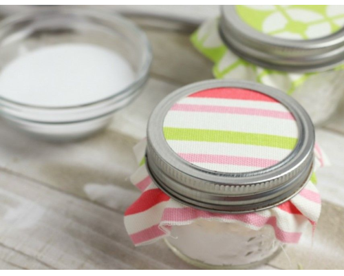 Put your baking soda in the bottom of the jar and add your drops of essential oils. Cover jar with the cloth and tie it on with the ribbon or string. Set it anywhere in your house that you would like to neutralize odors.