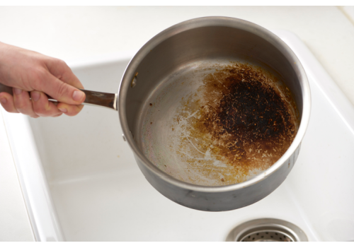 It can be really hard to get that burnt grime off of your pot, but don’t throw it away just yet. Try sprinkling a generous amount of baking soda on the bottom of the pot, and adding enough water to cover the dark spots. Bring to a boil and then dump in the sink. This should take away a large amount of black on the pot, and may even eliminate all of it. Clean what is left with dish detergent and a scrubbing sponge.