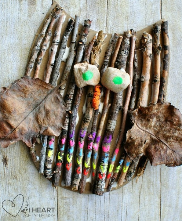 This stick owl is absolutely adorable! You can make any animal you want out of sticks and twigs! Just cut a piece of cardboard to the chosen animal shape, then break sticks and glue them on. Add some color with markers or paint and voila! This is such a cute, versatile project for kids of all ages (and adults too)!