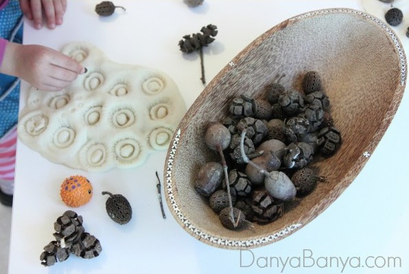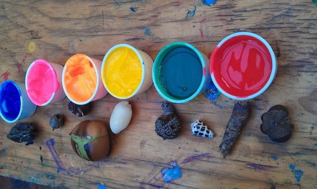 If you’re not afraid to get a little messy, grab some finger paint and let your kids paint with natural loose parts. Use natural objects as stamps and rollers or place them all in a tray and roll them around to create an abstract piece.