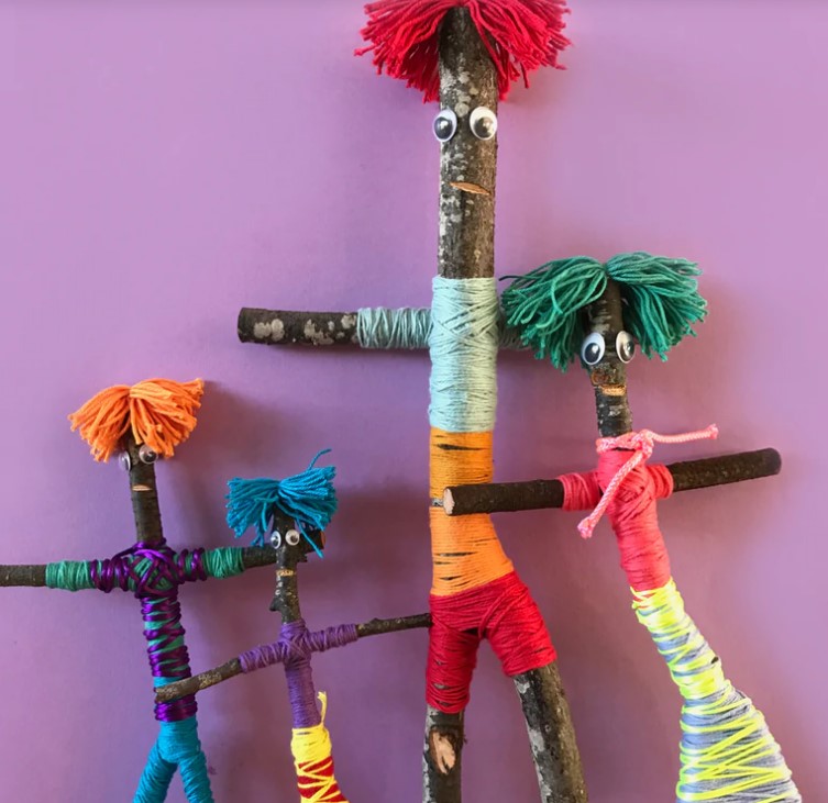 This is another great craft for older kids. Find some Y-shaped sticks to make people. Use colored yarn for clothes and glue on some googly eyes. The best thing about this project is that it doubles as a toy!