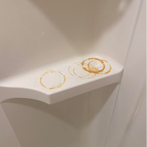 My shower always seems to get rust spots where we sit the shaving cream. If this is a problem in your house, wet the area where you see the spot and sprinkle crushed Aspirin on it. Let that sit for about 10 minutes and wipe it away with a wet cloth. No more stains!