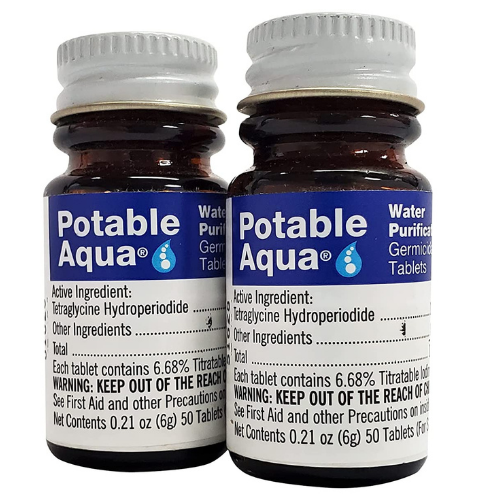 - Two bottles of 50 count Potable Aqua Water Purification Tablets