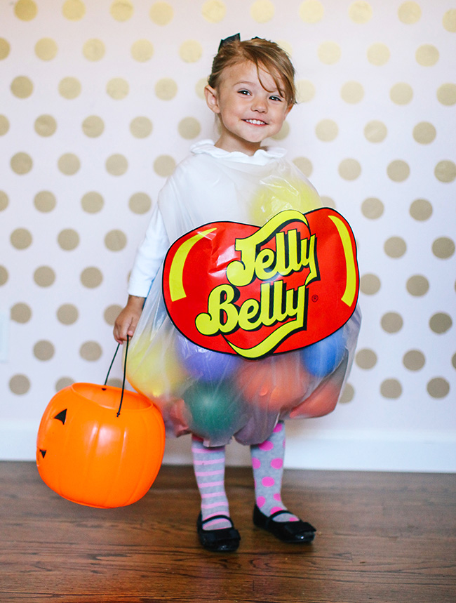 This one I have seen so many times, and every time I still think its the most clever costume! Just grab a clear trashbag and a bunch of colorful balloons and you got a cute bag of jelly beans costume. You can add the Jelly Beans logo and the nutrition facts too, but I think it looks just as good without.