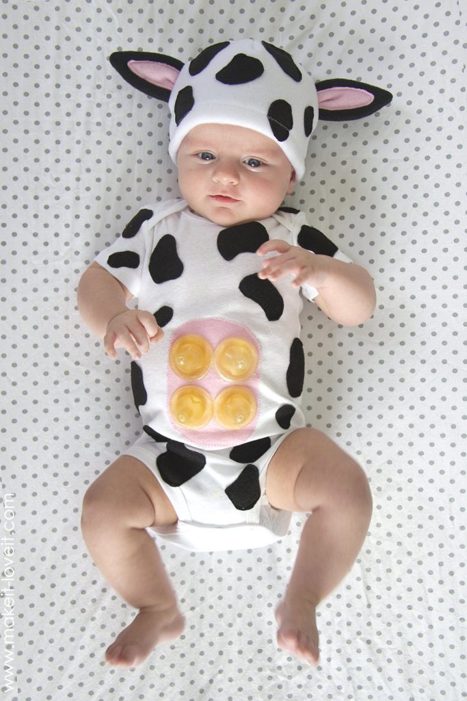 A white onesie and black and white construction paper (or felt) for spots, ears and the utter make the perfect combo for a baby cow outfit. If you don’t have any felt or construction paper around the house, use a marker to color the spots and make the ears. This can easily be sized up for older kids, too.