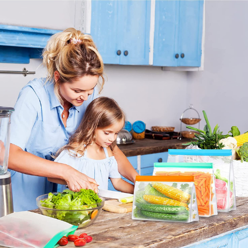 - FOOD GRADE MATERIAL & ECO-FRIENDLY-The reusable food storage bags made of good quality eco-friendly PEVA material, PVC-free, chloride-free, lead-free and BPA FREE. It is not harmful to the environment when disposed of or burned. Absolutely safe & healthy for families and the planet. One reusable food storage bags can replace up to 500 disposable plastic bags .Healthy and safe for family and earth.