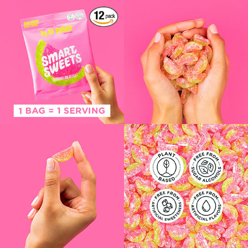 - KICK SUGAR: Feel good about candy with SmartSweets. Just 3g of sugar and 100 calories for the whole bag – that’s 91% less sugar than the other watermelon slice candies! Smartly sweetened with high-quality, natural sweeteners: monk fruit and allulose.