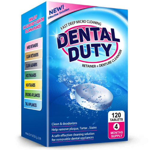 - REMOVES STAINS & DISCOLORATION – Whether it’s a retainer, set of dentures, or other device, dental appliances become yellowed and discolored without proper maintenance. Dental Duty tablets use ingredients that restore dental appliances to perfect clarity, brighten & whiten dentures, and minimize device visibility for a natural look and feel.