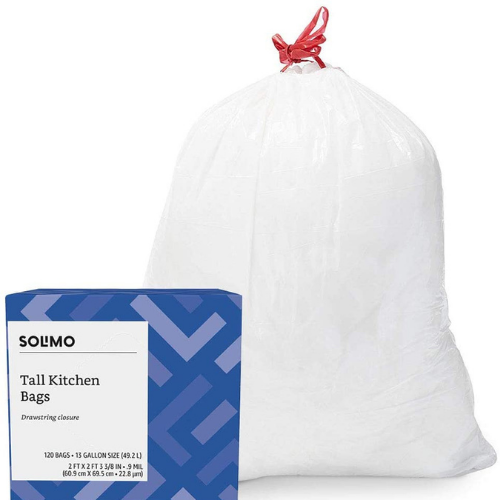 120 Count Solimo Tall Kitchen Drawstring Trash Bags, 13 Gallon as low as $12.74 Shipped Free (Reg. $14.99) | 11 ¢ per bag – Amazon Brand!