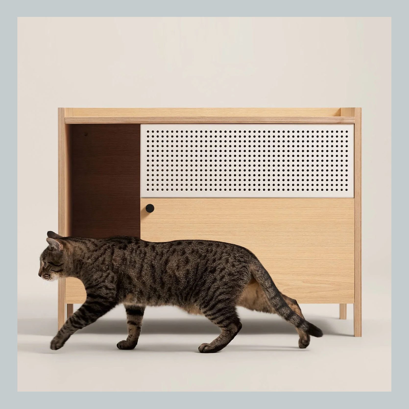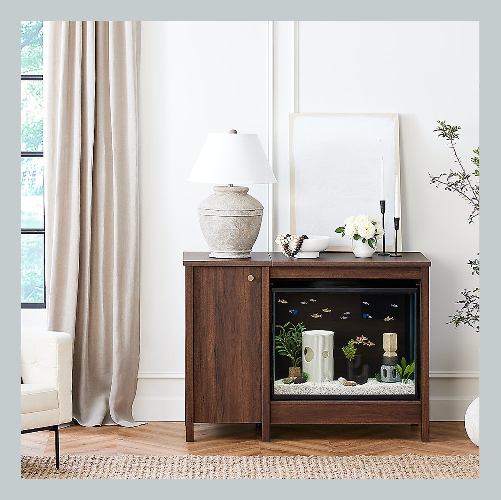 If you love your pet but aren’t too crazy about the aesthetics of their necessities, might I suggest investing in some specialty furniture? The mahogany console is specially made to hold aquariums, terrariums, or small pet habitats; your guests will never guess that a litter box was hiding inside that blonde Scandi-style cabinet.