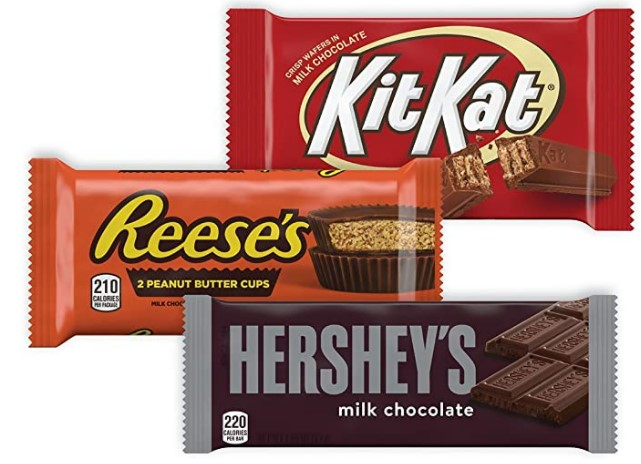 This box contains a mix of Hershey’s Milk Chocolate Bars, Kit Kat, and Reese’s Peanut Butter Cups. Yum!