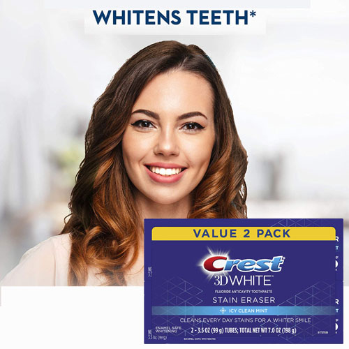 - Includes two 3.5 oz tubes of Crest 3D White Stain Eraser Icy Clean Mint Toothpaste