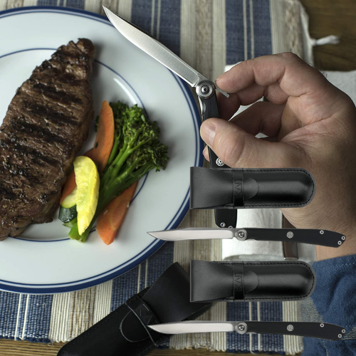 Hop over to Amazon and get a deal on 2-Pack KAI Manual Folding Japanese Pocketknives. The Kai Personal Steak Knife is razor sharp and folds compactly into a leather sheath to store discreetly in your pocket or purse This ingenious knife features a secure liner lock to ensure the blade stays safely open during use Made with Japanese 420J2 stainless steel with a beautiful finish and a razor-sharp 16 Degree cutting angle each side the Kai Personal Steak Knife glides through steaks like butter without crushing or tearing the meat causing flavorful juices to be lost
