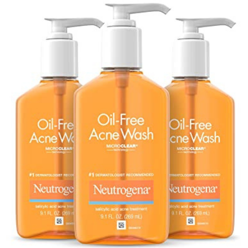 - 9.1-fluid ounce pump bottle of Neutrogena Oil-Free Acne Face Wash with salicylic acid to help fight acne while cleansing skin