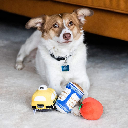 - Includes three plush squeaker dog toys: one apple, one yellow taxi cab, and one coffee