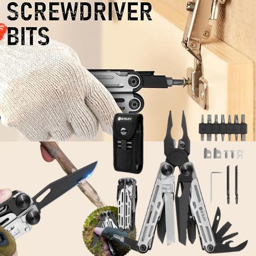 - All-in-one Multitool Pliers: This multi-tool with 31 tools including pliers, replaceable wire cutters, wire strippers, large scissors, punch, replaceable saw, knifes, wood/metal file, awl, bottle&can openers, ruler, 8 sets of screwdriver bit (PH1+PH4, SP8+SP4, TT25+TT20, TT15+TT10, SL6+SL5, SL4+SL3, H5+H4, H3+H2.5), ideal for outdoor activities, home works, daily DIY and more.