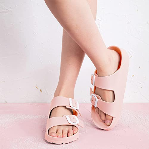 • PERFECT SUMMERS SLIDE SANDALS- Lightweight women’s slip-on sandals with double buckles are functional so you can adjust them according to your narrow or wide feet shape. Adjustable EVA sandals for women in summer is easy to slip on and off. A deep heel cup keeps natural cushioning right under the heel. Non-slip double buckle women’s slide sandals is great for summer as gardening shoes、beach sandals、 house slippers, pool sandals, shower bathroom slippers, travel slippers, etc.