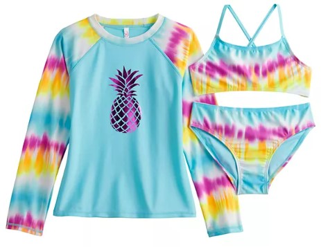 Tie Dye Foil Pineapple Bikini Top, Bottom, and Rash Guard – $27.60 (reg. $46)