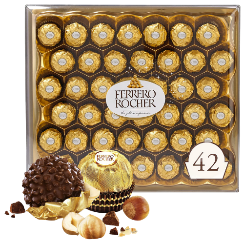 - 42 delicious Ferrero Rocher chocolate candies, presented in an impressive transparent gift box, the perfect Valentine’s Day or Chinese New Year gift for him or her