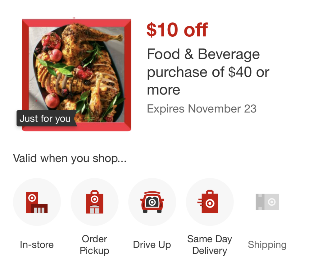 This offer is valid in-store and online with same-day pickup or delivery. This is such a great offer to get with the rising prices of groceries, especially in time for Thanksgiving!