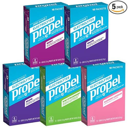 - Contains five (5) 10-count boxes of Propel Powder Packets Raspberry Lemonade (1), Berry (1), Grape (2), Kiwi Strawberry (1) with Electrolytes, Vitamins and No Sugar