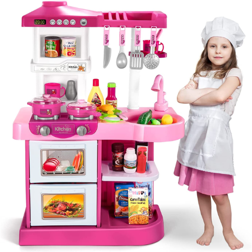 • NUMEROUS ACCESSORIES: The kids’ kitchen table includes play stove, cooking utensil, spray, play sink with running water, kinds of kitchen accessories, stickers and extra counter top space for setting dishes! 3 AA batteries are required (Not included).