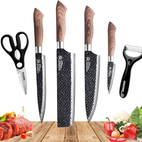 • ALL-IN-ONE KNIFE SET- This high quality Chef Knife set includes 8” chef knife, 8” cleaver knife, 3.5” paring knife, 3.5” ceramic peeler and scissors. the sharp kitchen knives set can help you finish cooking in a relaxed way and let you enjoy it.