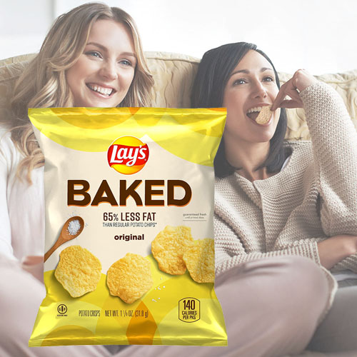 - 64 Count of 1.125 ounces bags of Lay’s Oven Baked 65 percent Less Fat Original Potato Chips