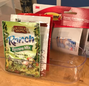 Many of us have areas on the side of the pantry that are just empty wall space.  Grab some Command Caddies that stick right to the wall and use that to hold seasoning packets, drink mixes and other small items.  These are items that are always getting lost in the back corners of the pantry, now you’ve got them in a place where they stay together and you’re using extra space you didn’t have before!