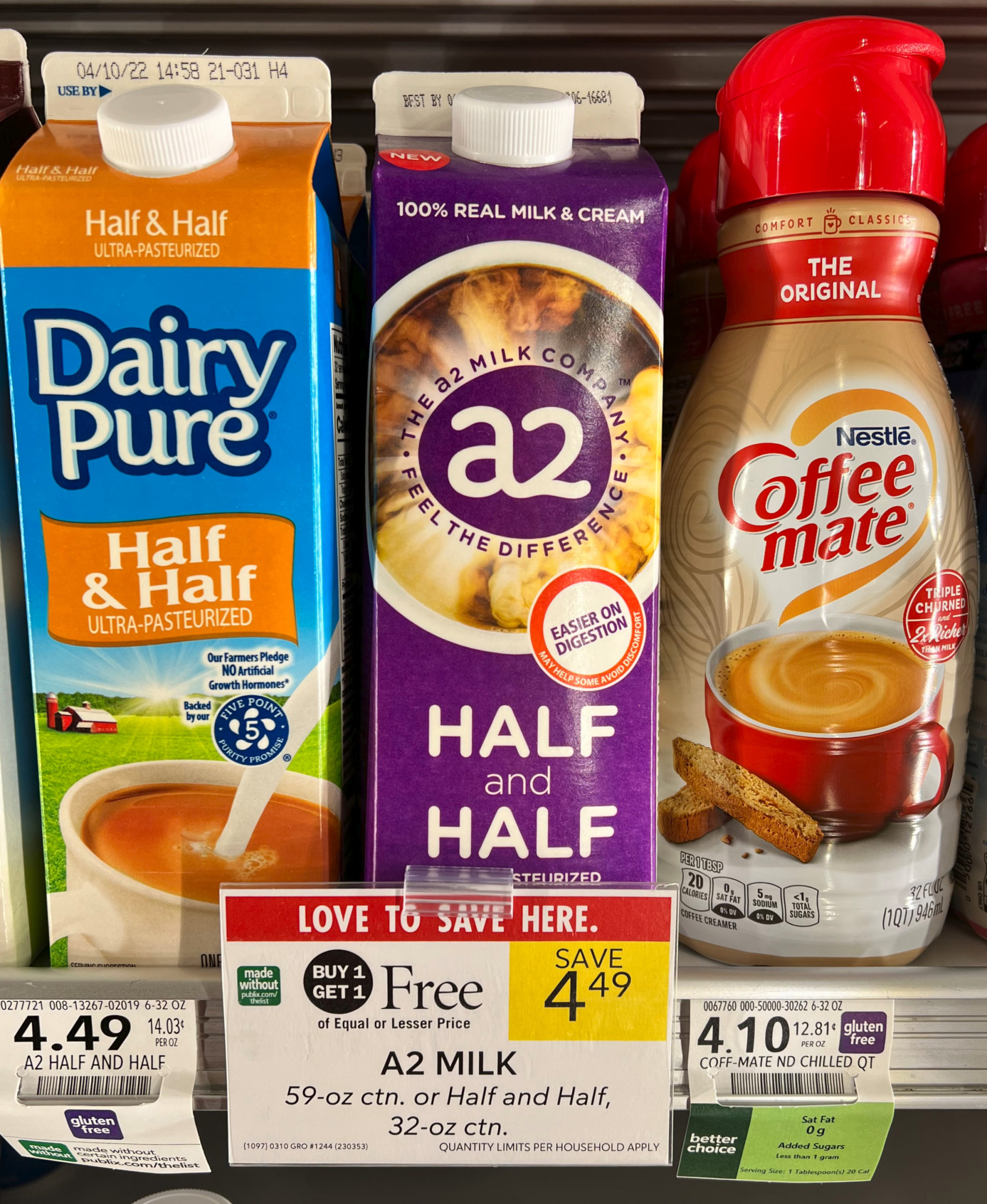 We have a nice deal on A2 Milk Half and Half at Publix. Combine the sale and coupon to pick up a carton for just $1.25… that’s almost a quarter of the regular price