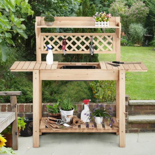 Spacious open space for your gardening needs. Topeakmart Natural Fir Potting Bench is made with solid fir wood making this bench table sturdy and durable. The tabletop can be slide to open with an underneath dry sink and can be closed to pick up and put down gardening tools while working outdoor. Also feature, one wide-open bottom shelf that has enough space to place other handy equipments and soils. Customers can customize this wooden potting work station into any color and coating as they want. The versatile design allow this potting bench be used conveniently either outdoor or indoor, and the farmhouse style makes this bench simple & easy to keep in any space.
