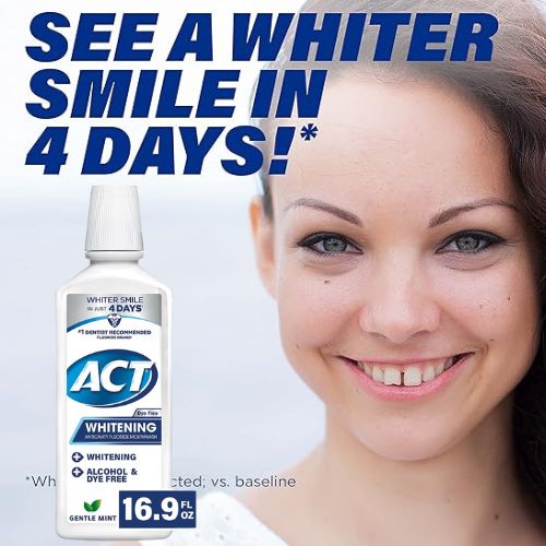 - WHITEN TEETH: Enjoy a whiter smile in four days** when you rinse with ACT Whitening Mouthwash