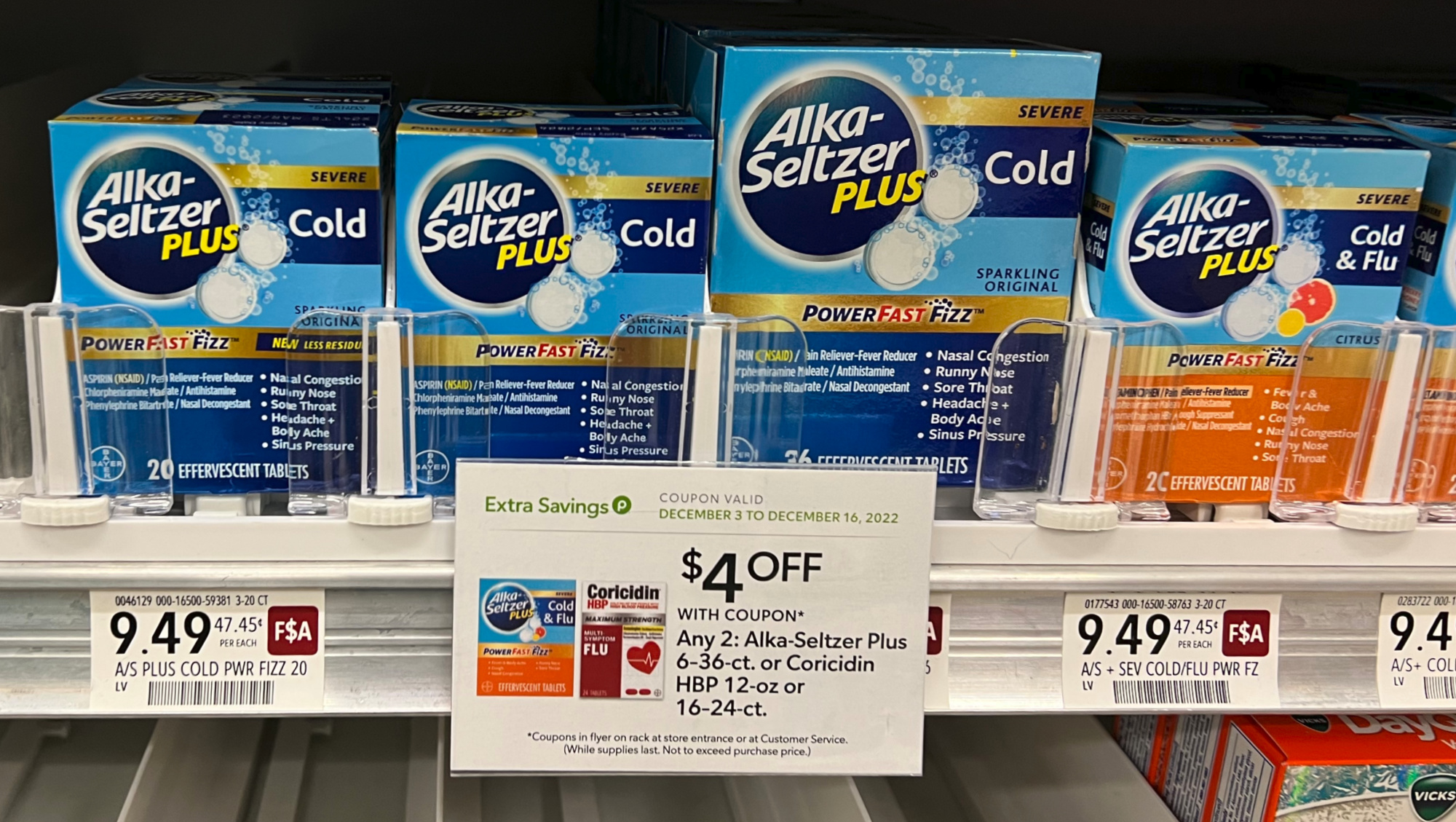 -$4/2 Alka-Seltzer Plus, 6 to 36 ct, or Coricidin HBP 12 oz, or 16 to 24 ct, Extra Savings Flyer In-Ad Publix Coupon (valid 12/3 to 12/16)