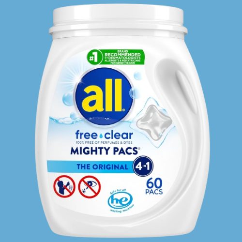 Hop over to Amazon and get a deal on All Mighty Pacs Laundry Detergent 60-Count Tub, 60 Count. All free clear mighty pacs are 100 Percent free of perfumes and dyes with concentrated cleaning power in a convenient pac. All free clear is the #1 recommended detergent brand by dermatologists, allergists and pediatricians for sensitive skin. These hypoallergenic mighty pacs are tough on stains, gentle on skin. Clip the 20% off coupon. Choose to Subscribe & Save, and you will score a great deal. Just make sure you have 5 or more items in your monthly order to max out the available discount of 15% off this item = $14.42, minus coupon = $11.03! Subscribe & Save shipping is free!