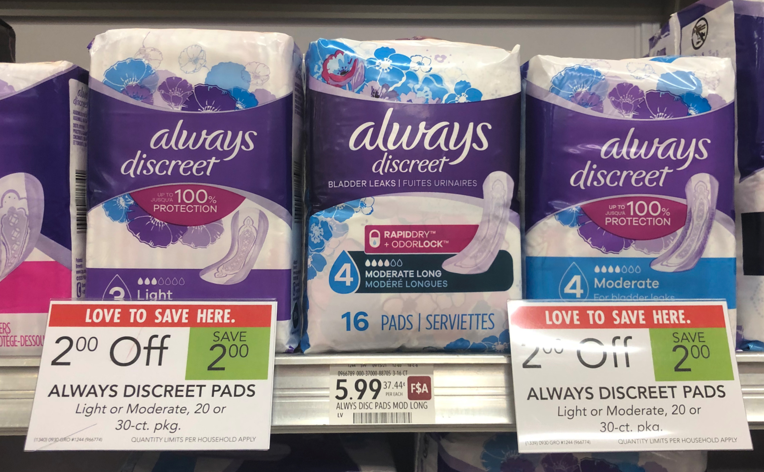 –$5/2 Always Discreet Incontinence Products (excludes 24 ct and 26 ct Always Discreet Liners and other Always Products and trial/travel size) (Publix Digital Coupon)