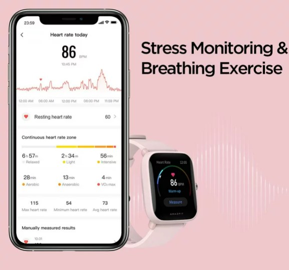 This smartwatch serves as a GPS and fitness tracker. It monitors your blood oxygen, heart rate, sleep and stress. It is water resistant and has 60+ sports modes. Enjoy a 9-day battery life on a single charge. Grab it in pink, green or black.