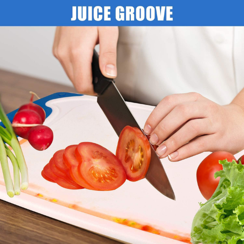 • NON-SLIP & JUICE GROOVES: equipped with four nonslip rubber feet on bottom, these plastic cutting boards is much safer for you to cut on. The deep juice groove collects excess liquids, preventing spills.