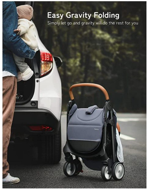 This compact stroller features a one-hand gravity fold, full-size waterproof canopy, and multiple recline positions.