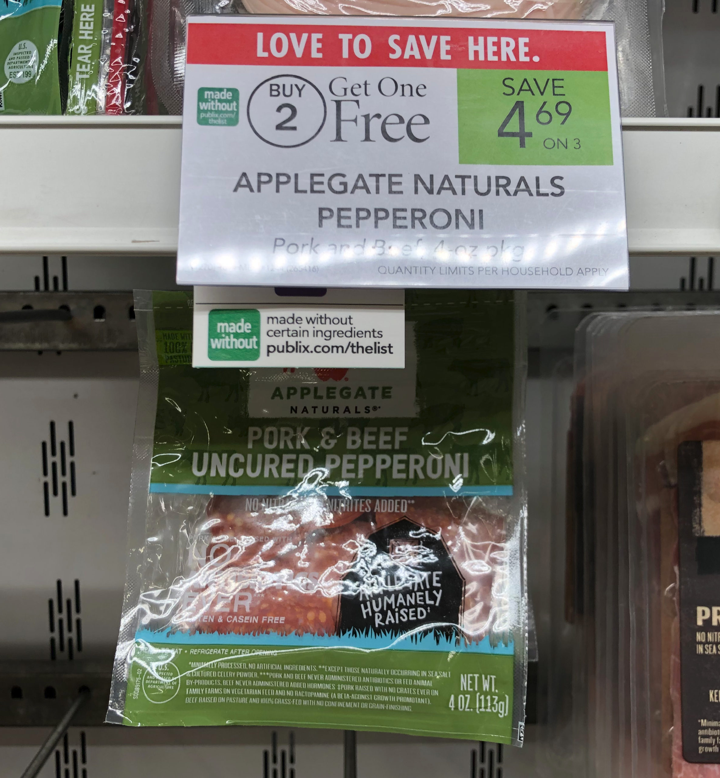 Applegate Naturals Pepperoni, Pork and Beef, 4 oz, B2G1, $4.69