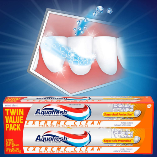 - Contains Two 5.6 oz tubes of Aquafresh Extreme Clean Whitening Action