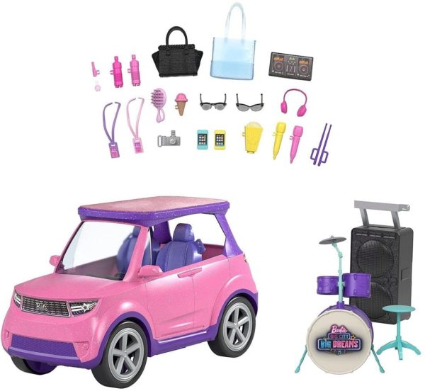 • ​Take the show on the road in a glittery pink and purple SUV with rolling wheels, realistic details and room for 2 Barbie dolls (sold separately)