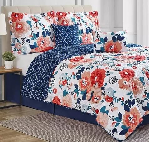 Includes 1 quilt, 2 shams, 1 bedskirt, 2 decorative pillows