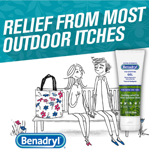 - 3.5-ounce tube of Benadryl Extra-Strength Cooling Itch Stopping Anti-Itch Gel for fast cooling relief from skin pain and itching from most outdoor itches