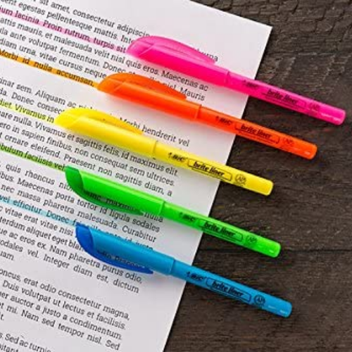- Super-bright fluorescent ink in yellow, pink, orange, green, and blue