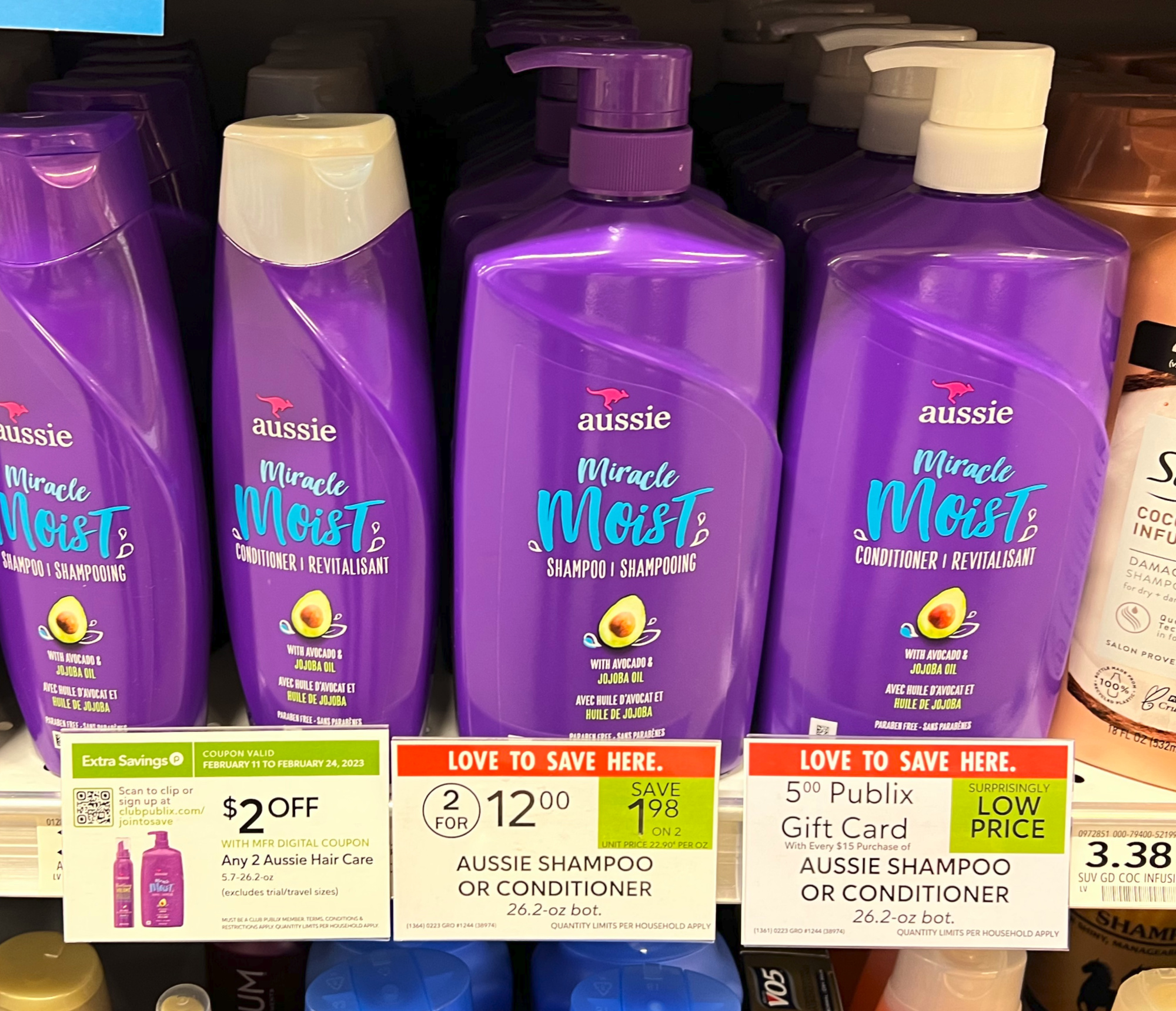 –$2/2 Aussie Shampoo, Conditioner, OR Styling Products (excludes Masks, trial/travel size). (Publix Digital Coupon)