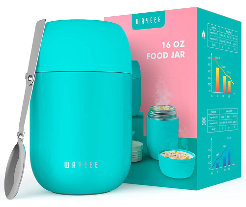 Hop over to Amazon and get a deal on Blue Insulated Food Jar Vacuum Bento Box Lunch Containers, 16 oz.  This enables children or adults to eat hot dishes or cold sweets wherever they are, whether they are indoors or outdoors. The FOOD-GRADE cover doubles as a serving bowl and a FOLDABLE 180° spoon is included.