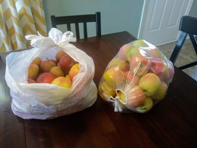 (I also bought about 20lbs of apples from our favorite roadside stand for $8. The apples in the grocery sack are assorted “seconds,” – various sizes and kinds for $2 – and the other bag is 10lbs of Pink Lady apples.)
