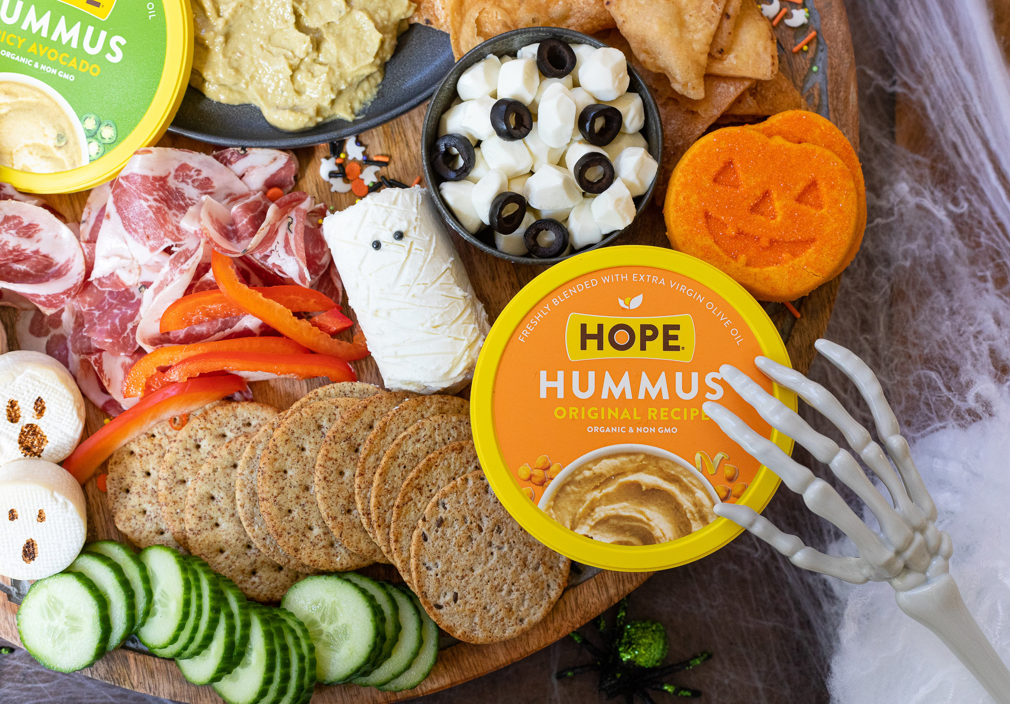 Ok, ok… I know it’s not the most pleasant sounding snack that you can serve. BUT, I can guarantee you that festive little pumpkin will get more attention of any other snack on the table! It’s gross and funny, spooky and kookie and thanks to HOPE Hummus, it’s downright delicious too!
