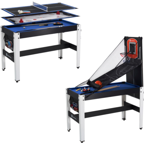 - 48″ four-in-one multi-game table features four classic games: billiards, table tennis, slide hockey, and basketball.