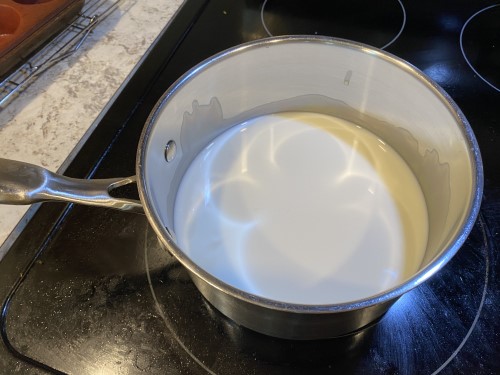 Heat the milk until it’s simmering and remove from the heat. Then add garlic powder, paprika, and 1 cup of the cheddar cheese.